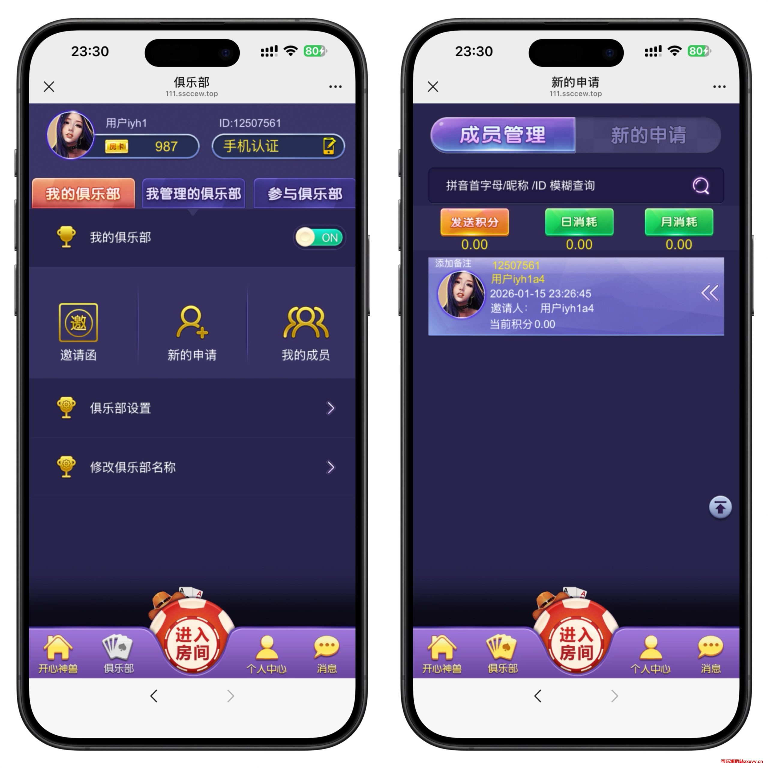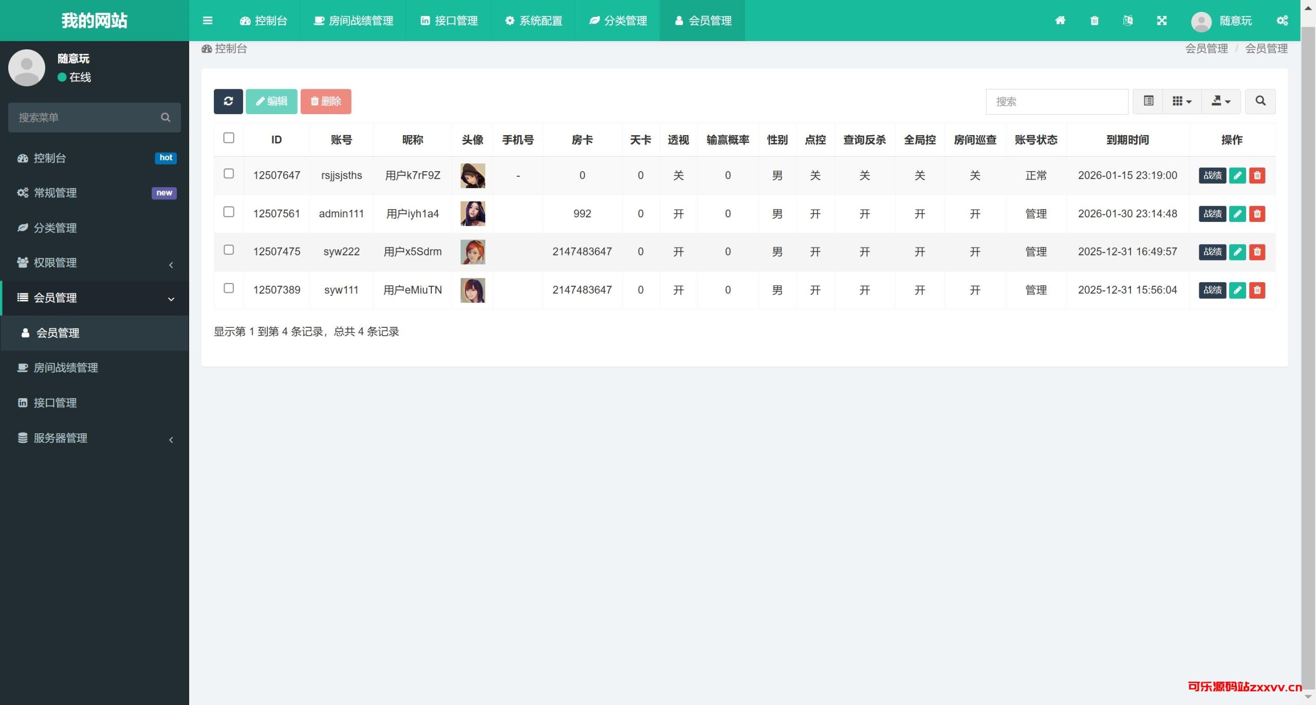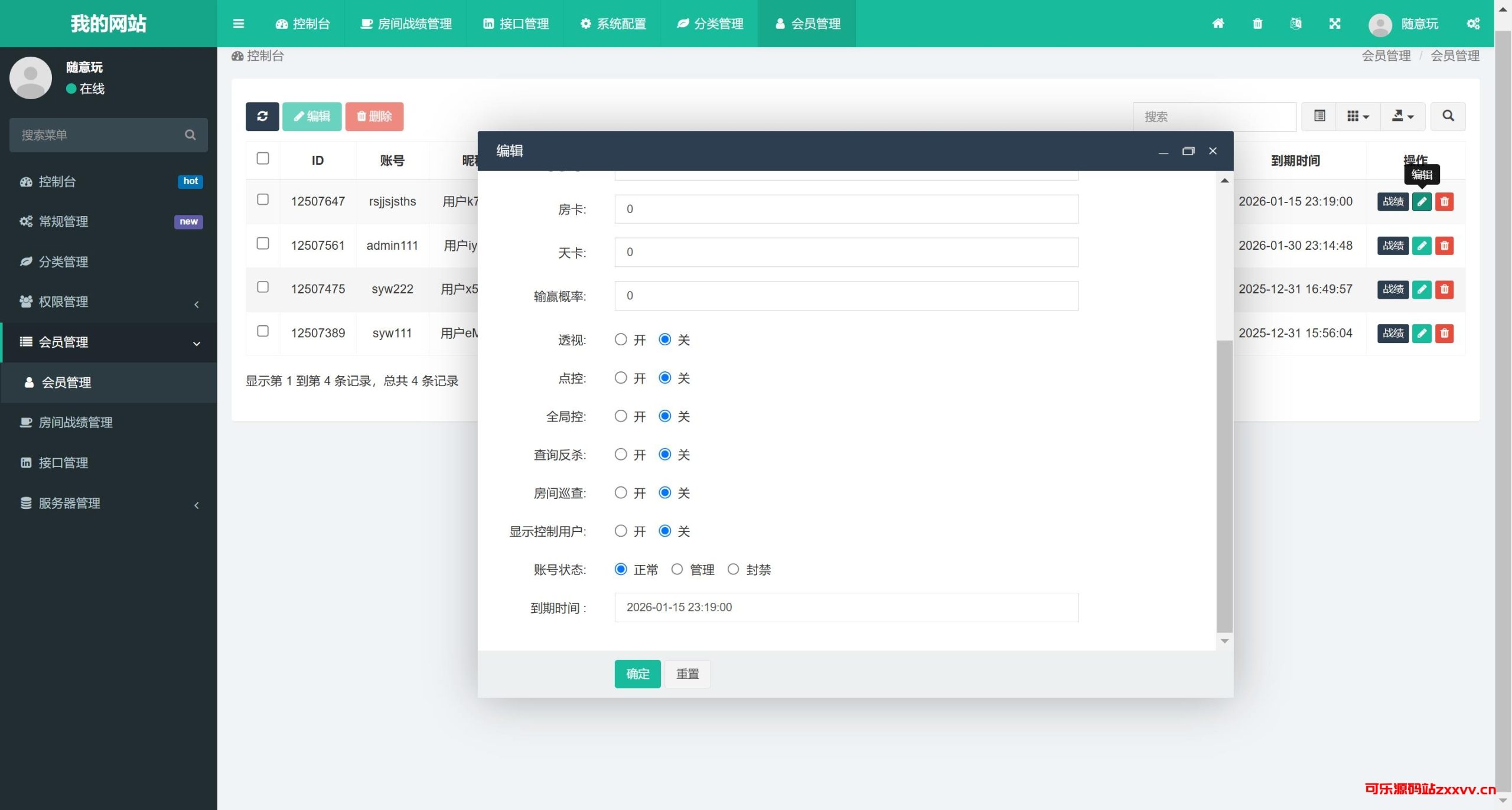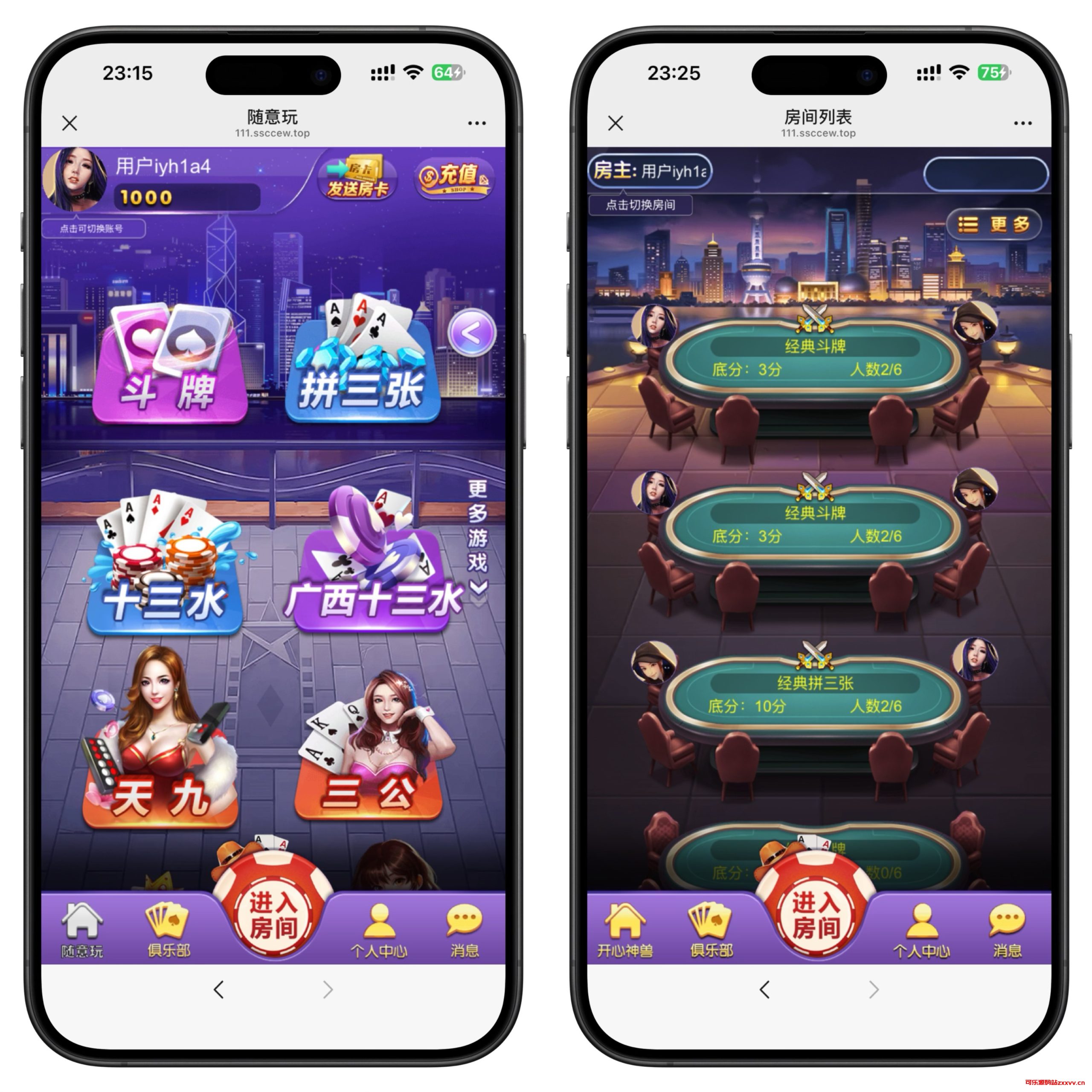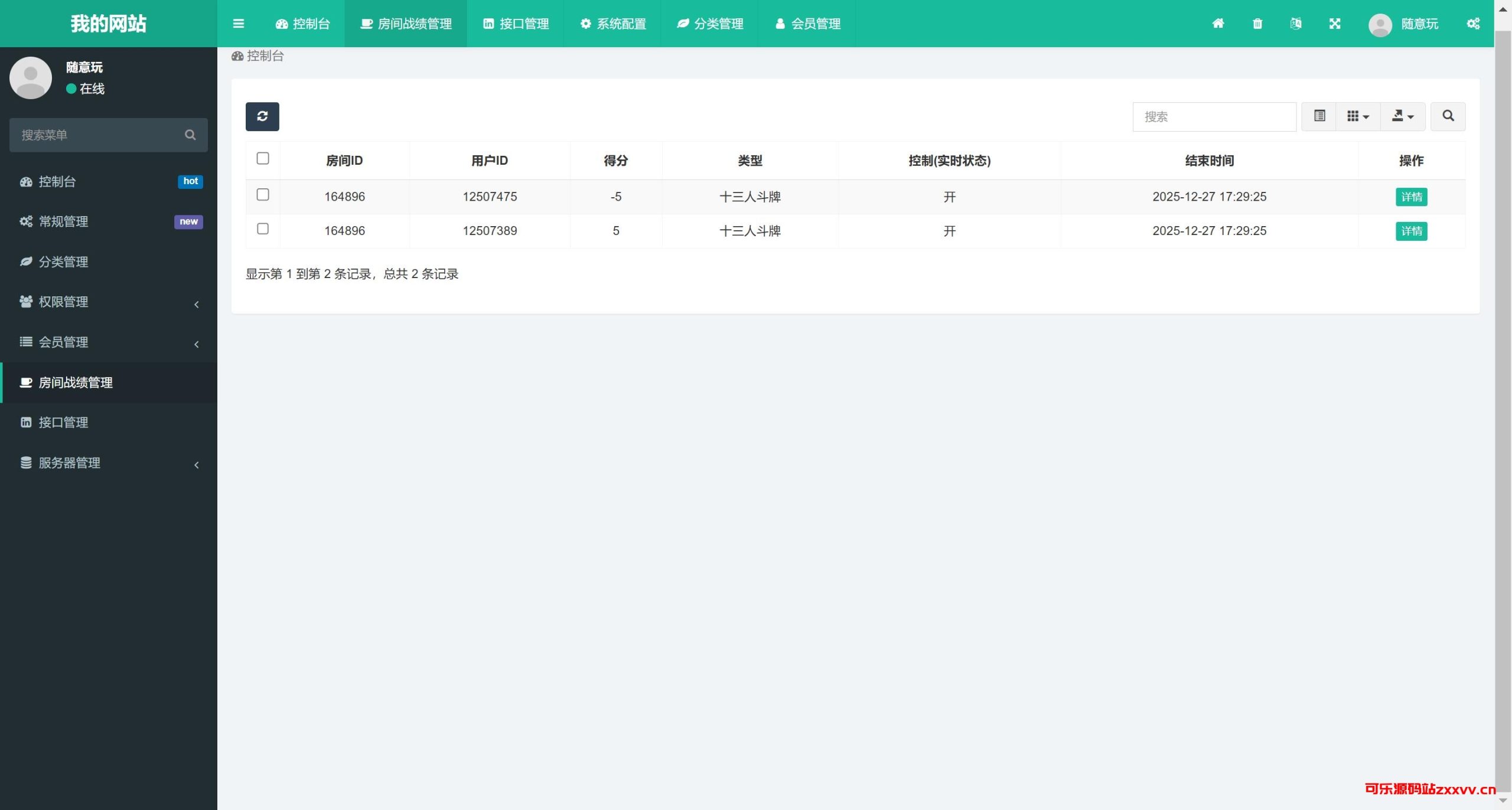 共四个游戏,牛牛、金花、十三水、斗地主全带控制。游戏模式是房卡+积分双模式。